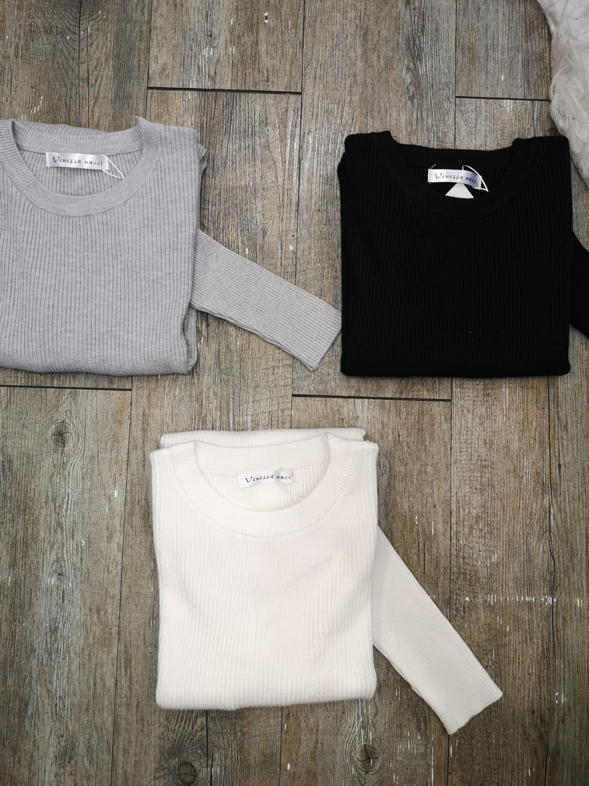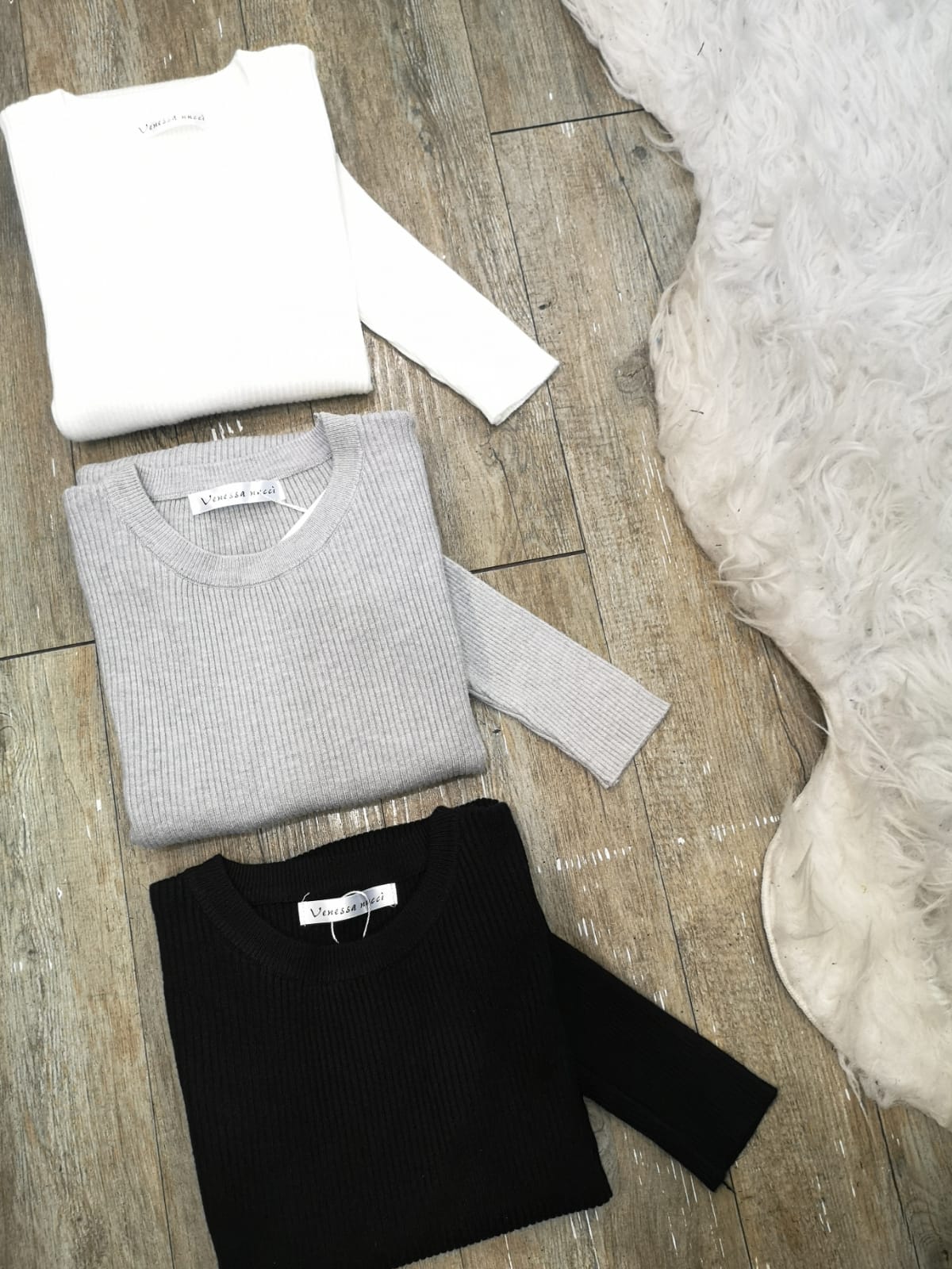Photo a plat plié des différentes couleur dans le pull col rond basic. De haut en bas Blanc, Gris, Noir